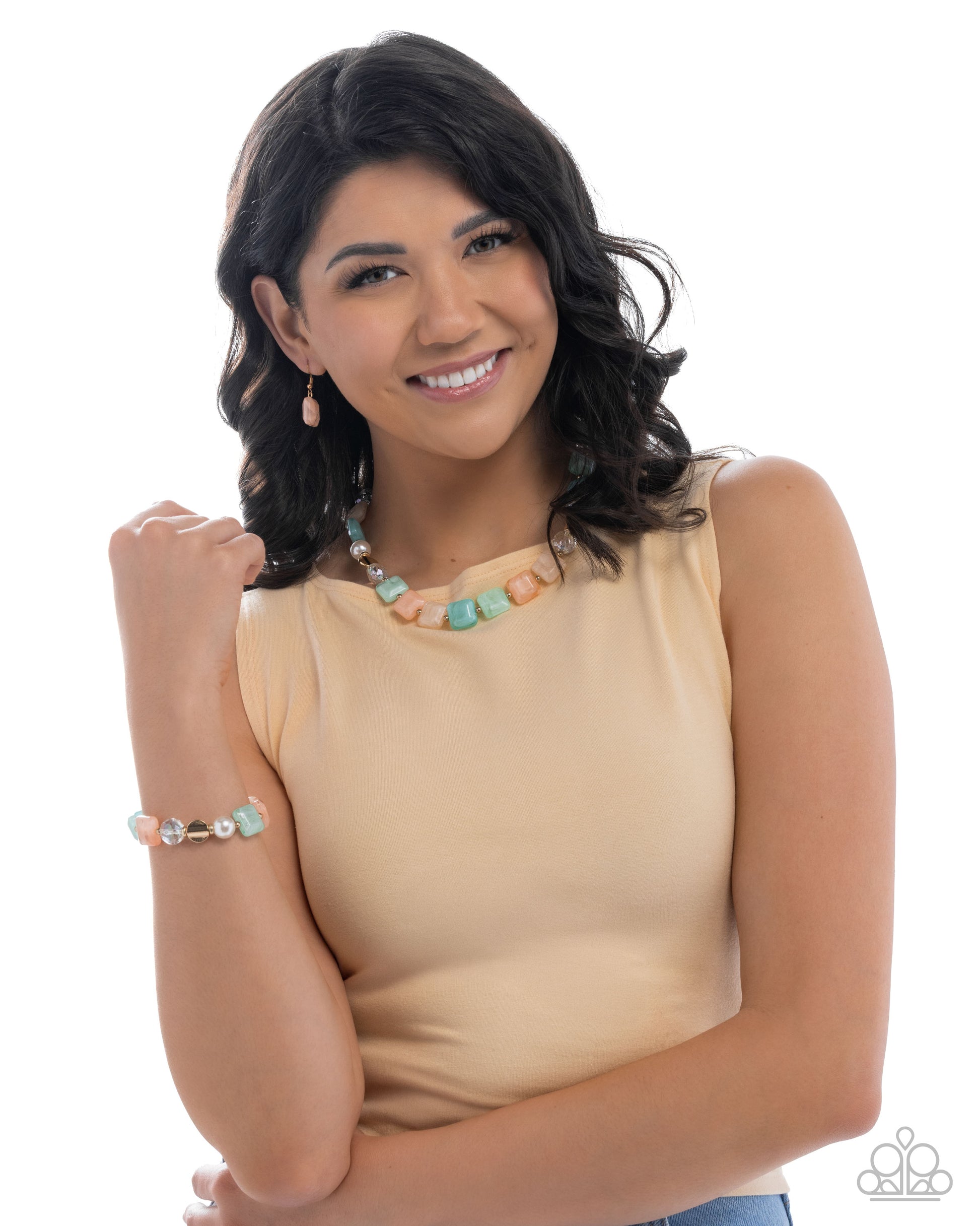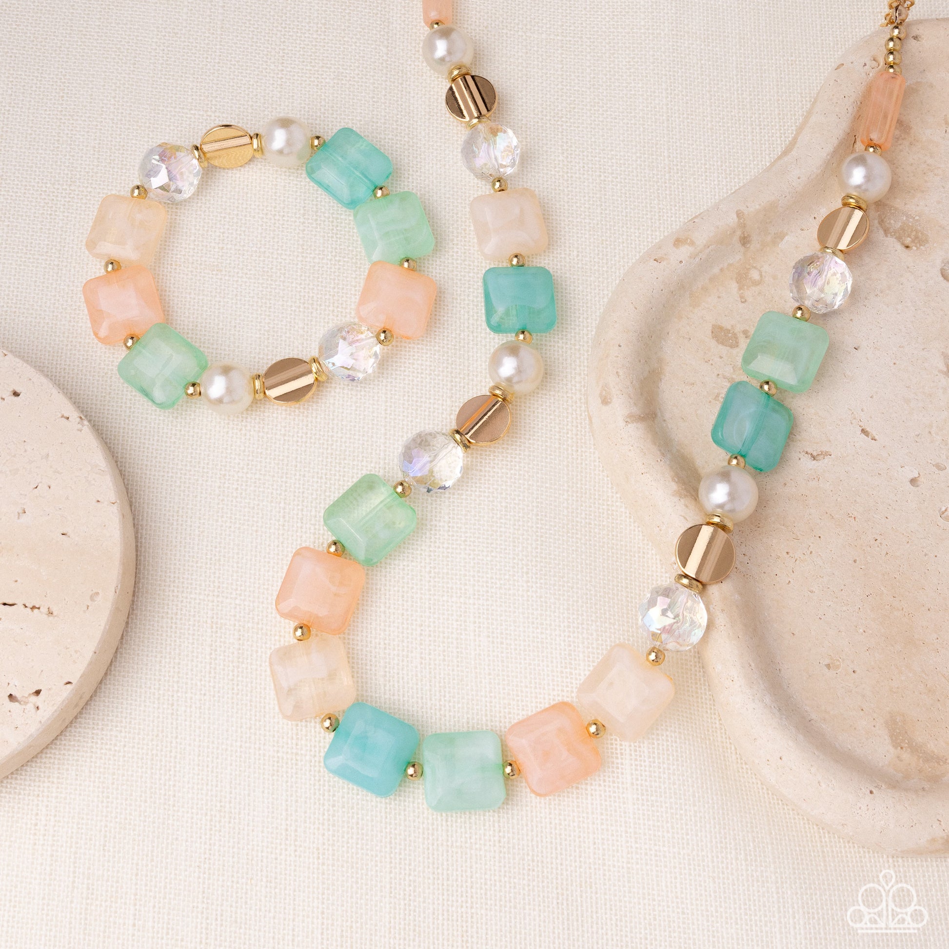 Infused along an elastic stretchy band, a collection of flattened gold beads, iridescent pearls, gold studs and discs, faceted clear beads, and swirly blue, orange, light green, and light yellow cubes and cylinders pattern and coalesce around the wrist for a colorfully chic display.