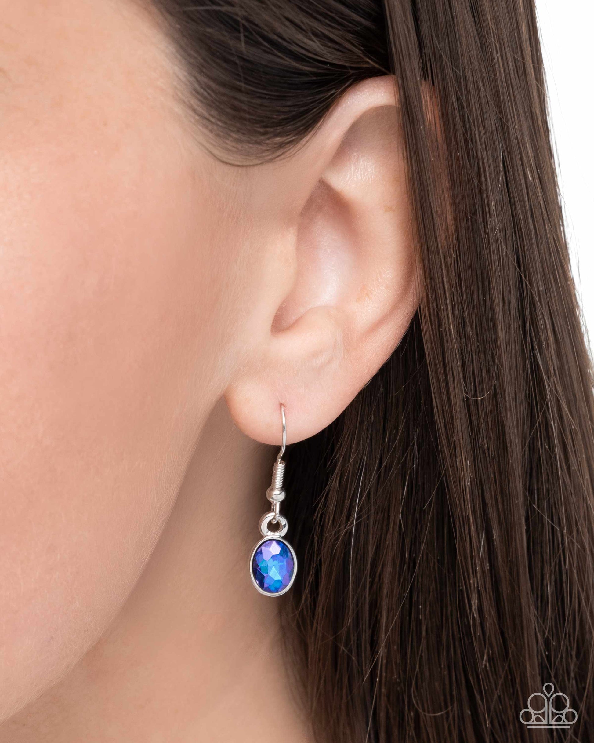 Pressed in upside-down teardrop and oval silver frames, a collection of purple and blue UV shimmery gems connecting to dainty silver cable chains, extend below the neckline to a purple UV shimmery gem heart for a pop of flashy feminine color. Features an adjustable clasp closure.